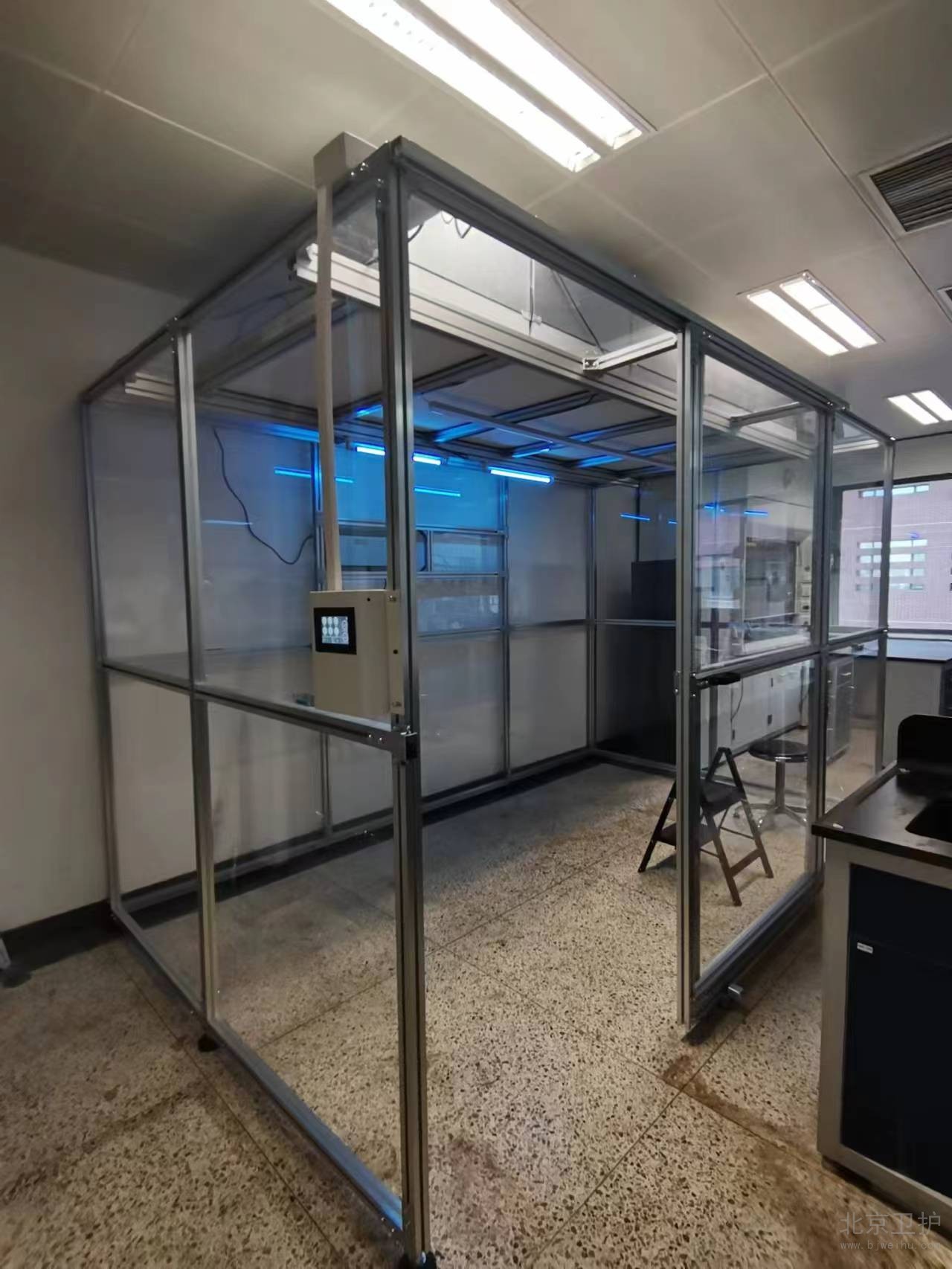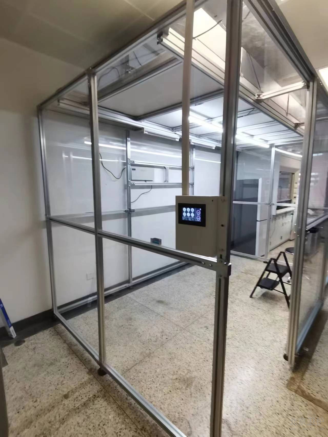 9月份我公司接到此項(xiàng)目后便抓緊時(shí)間出具相關(guān)方案、設(shè)計(jì)圖紙,經(jīng)過不斷的溝通和改動,最終確定施工方案。此單位潔凈棚設(shè)計(jì)面積20平米,主體材質(zhì)為鋁型材,隔離板使用亞格力板,頂部配有紫外線燈輔助殺菌,過濾系統(tǒng)為百級凈化模塊,并配有我公司研發(fā)的控制系統(tǒng)。從最初的方案設(shè)計(jì)、安裝施工,到最后的驗(yàn)收,總工期為10個(gè)工作日。